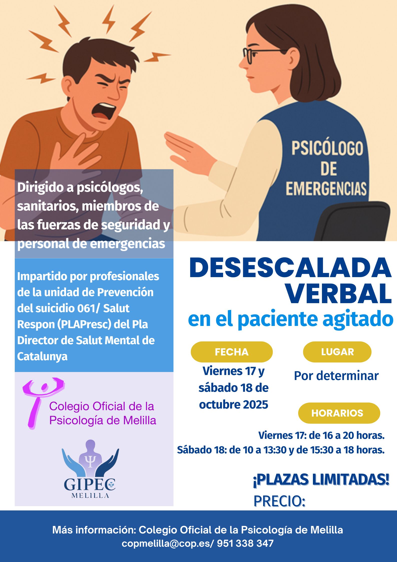 El Grupo en Intervención Psicológica en Emergencias y Catástrofes (GIPEC) del COP Melilla organiza para los días 17 y 18 de octubre del presente año el curso ‘Desescalada verbal en el paciente agitado’, en un lugar aún por determinar.